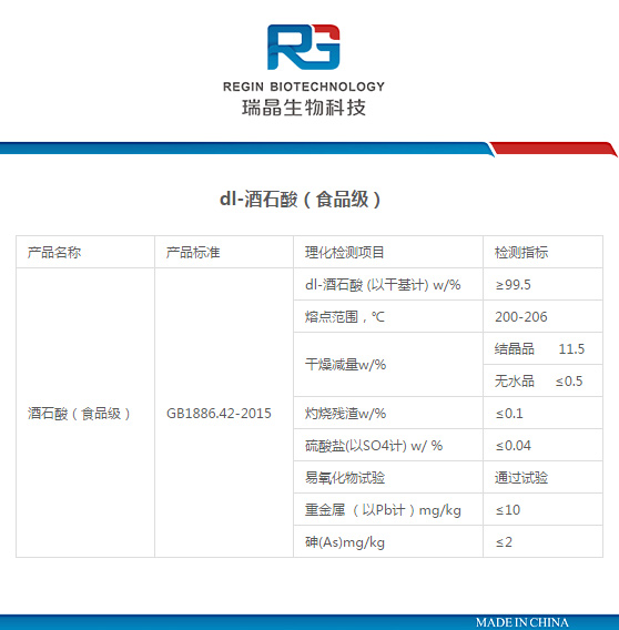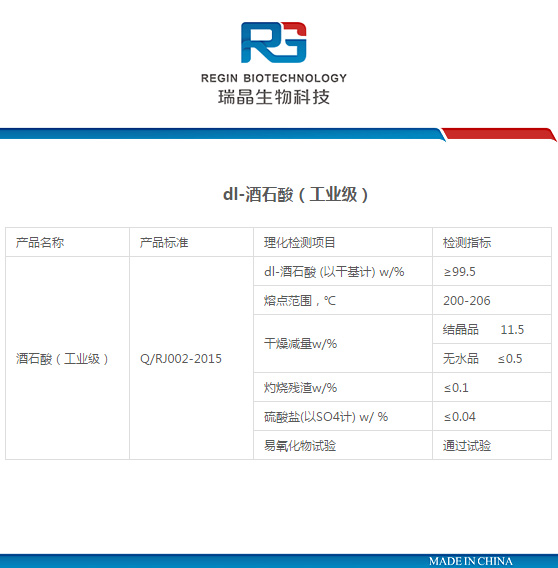 廣泛用于食品、醫(yī)藥、化工、輕工等行業(yè),主要用于制造酒石酸鹽類,如酒石酸銻鉀、酒石酸鉀鈉等。在食品行業(yè)用作啤酒發(fā)泡劑、食品酸味劑、矯味劑等。其酸味為檸檬酸的1.3倍,特別適用作葡萄汁的酸味劑。本品經(jīng)FAO/WHO專家委員會(huì)鑒定為優(yōu)良之食品添加劑。它在鞣革、照相、玻璃、搪瓷、電訊器材等工業(yè)也有非常重要的作用。
